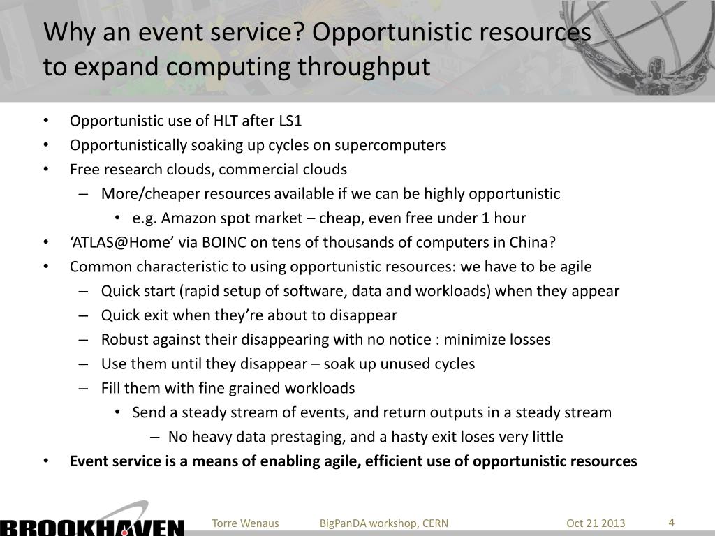 Why an event service? Opportunistic resourcesto expand computing throughput • Opportunistic use of HLT after LS1 • Opportunistically soaking up cycles on supercomputers • Free research clouds, commercial clouds • More/cheaper resources available if we can be highly opportunistic • e.g. Amazon spot market – cheap, even free under 1 hour • ‘ATLAS@Home’ via BOINCon tens of thousands of computers in China? • Common characteristic to using opportunistic resources: we have to be agile • Quick start (rapid setup of software, data and workloads) when they appear • Quick exit when they’re about to disappear • Robust against their disappearing with no notice : minimize losses • Use them until they disappear – soak up unused cycles • Fill them with fine grained workloads • Send a steady stream of events, and return outputs in a steady stream • No heavy data prestaging, and a hasty exit loses very little • Event service is a means of enabling agile, efficient use of opportunistic resources Torre Wenaus BigPanDA workshop, CERN