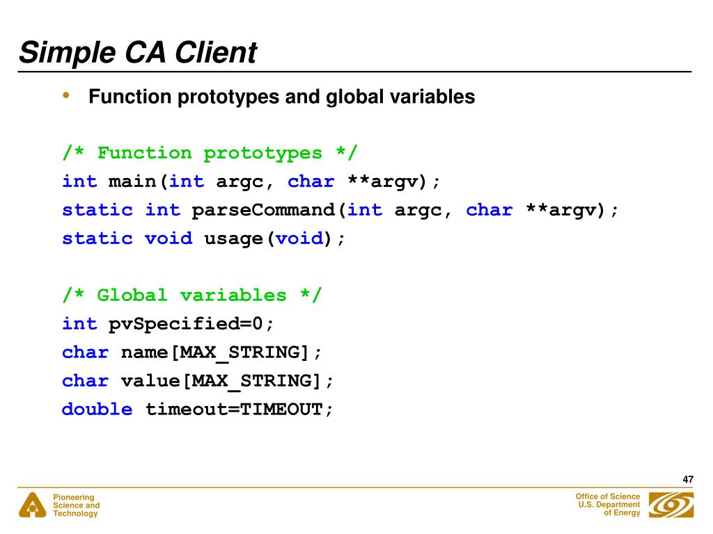 Simple CA Client • Function prototypes and global variables /* Function prototypes */ int main(int argc, char **argv); staticint parseCommand(int argc, char **argv); staticvoid usage(void); /* Global variables */ int pvSpecified=0; char name[MAX_STRING]; char value[MAX_STRING]; double timeout=TIMEOUT;