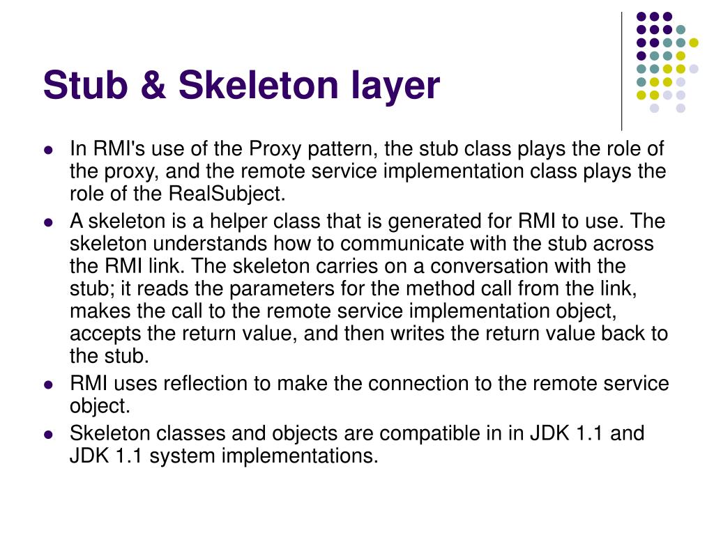 Stub & Skeleton layer • In RMI's use of the Proxy pattern, the stub class plays the role of the proxy, and the remote service implementation class plays the role of the RealSubject. • A skeleton is a helper class that is generated for RMI to use. The skeleton understands how to communicate with the stub across the RMI link. The skeleton carries on a conversation with the stub; it reads the parameters for the method call from the link, makes the call to the remote service implementation object, accepts the return value, and then writes the return value back to the stub. • RMI uses reflection to make the connection to the remote service object. • Skeleton classes and objects are compatible in in JDK 1.1 and JDK 1.1 system implementations.