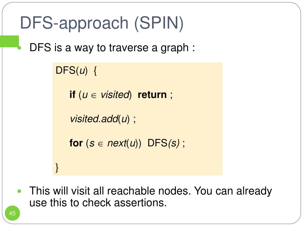DFS-approach (SPIN) • DFS is a way to traverse a graph : • This will visit all reachable nodes. You can already use this to check assertions. DFS(u) { if (u visited) return ; visited.add(u) ; for (snext(u)) DFS(s) ; }