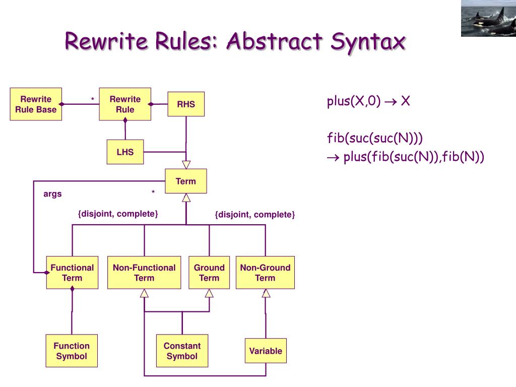 Rewrite Rule RHS * LHS Term * args {disjoint, complete} {disjoint, complete} Functional Term Non-Functional Term Ground Term Non-Ground Term Function Symbol Constant Symbol Variable Rewrite Rules: Abstract Syntax Rewrite Rule Base plus(X,0) X fib(suc(suc(N))) plus(fib(suc(N)),fib(N))