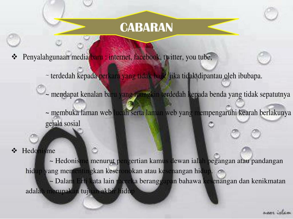 CABARAN • Hedonisme • ~ Hedonisme menurut pengertian kamus dewan ialah pegangan atau pandangan hidup yang mementingkan keseronokan atau kesenangan hidup. • ~Dalam Erti kata lain mereka beranggapan bahawa kesenangan dan kenikmatan adalah merupakan tujuan akhir hidup