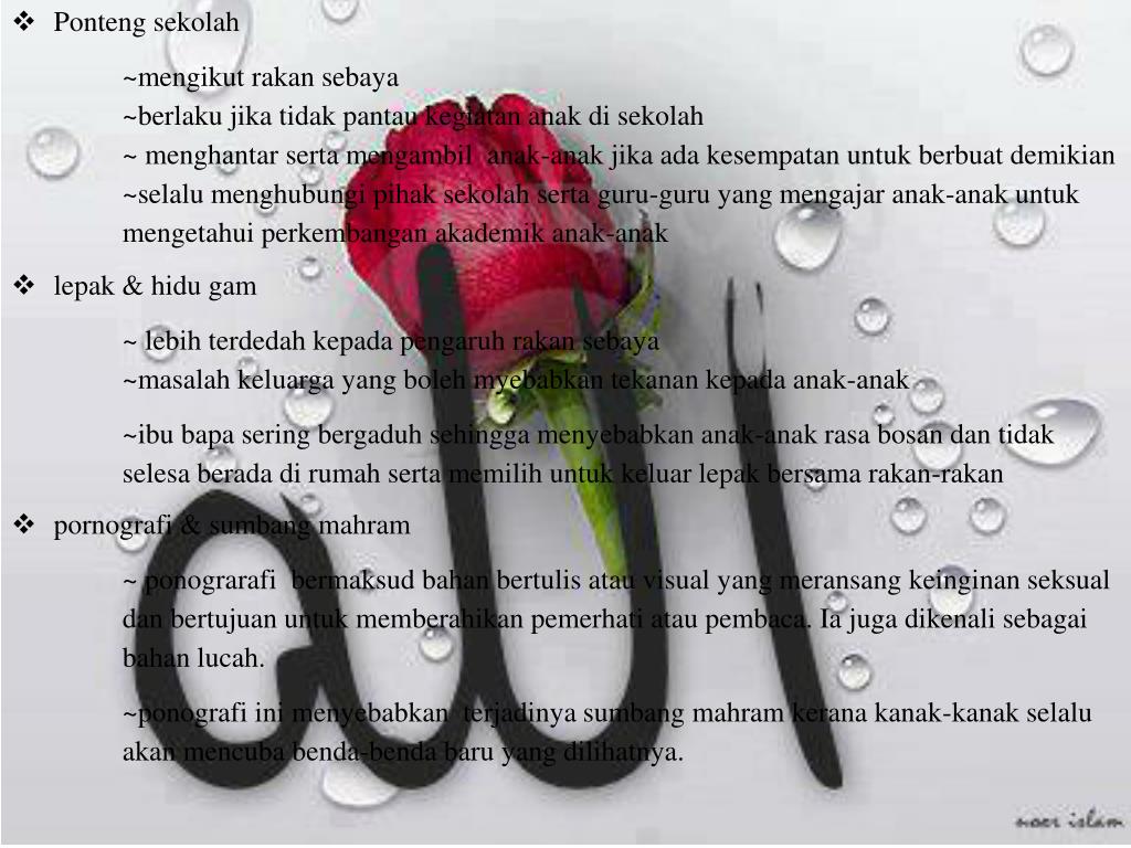 Ponteng sekolah • ~mengikut rakan sebaya~berlaku jika tidak pantau kegiatan anak di sekolah~ menghantar serta mengambil anak-anak jika ada kesempatan untuk berbuat demikian~selalu menghubungi pihak sekolah serta guru-guru yang mengajar anak-anak untuk mengetahui perkembangan akademik anak-anak • lepak & hidu gam • ~ lebih terdedah kepada pengaruh rakan sebaya~masalah keluarga yang boleh myebabkan tekanan kepada anak-anak • ~ibu bapa sering bergaduh sehingga menyebabkan anak-anak rasa bosan dan tidak selesa berada di rumah serta memilih untuk keluar lepak bersama rakan-rakan • pornografi & sumbang mahram • ~ ponograrafi bermaksud bahan bertulis atau visual yang meransang keinginan seksual dan bertujuan untuk memberahikan pemerhati atau pembaca. Ia juga dikenali sebagai bahan lucah. • ~ponografi ini menyebabkan terjadinya sumbang mahram kerana kanak-kanak selalu akan mencuba benda-benda baru yang dilihatnya.