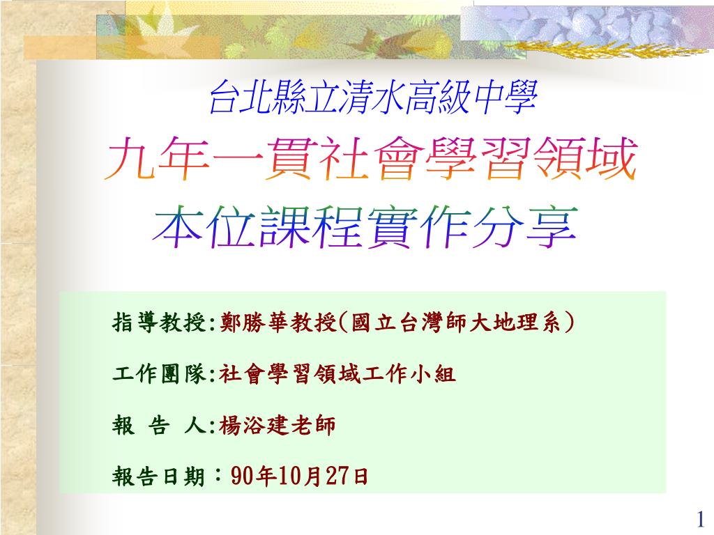 台北縣立清水高級中學 九年一貫社會學習領域 本位課程實作分享 指導教授:鄭勝華教授(國立台灣師大地理系) 工作團隊:社會學習領域工作小組 報 告 人:楊浴建老師 報告日期:90年10月27日