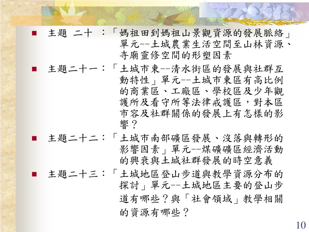 主題 二十 :「媽祖田到媽祖山景觀資源的發展脈絡」 單元--土城農業生活空間至山林資源、 寺廟靈修空間的形塑因素 • 主題二十一:「土城市東--清水街區的發展與社群互 動特性」單元--土城市東區有高比例 的商業區、工廠區、學校區及少年觀 護所及看守所等法律戒護區,對本區 市容及社群關係的發展上有怎樣的影 響? • 主題二十二:「土城市南部礦區發展、沒落與轉形的 影響因素」單元--煤礦礦區經濟活動 的興衰與土城社群發展的時空意義 • 主題二十三:「土城地區登山步道與教學資源分布的 探討」單元--土城地區主要的登山步 道有哪些?與「社會領域」教學相關 的資源有哪些?