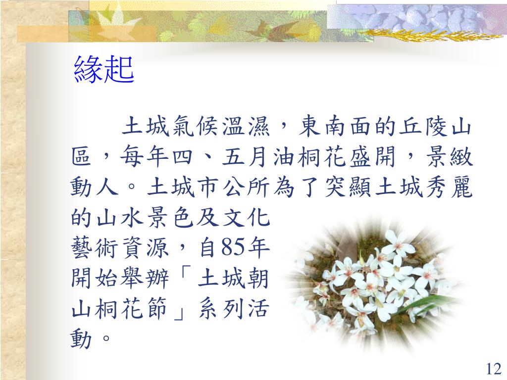 參、課文補注 一、土城朝山桐花節的由來 「土城桐花節」是以「土城油桐花」為主題,突顯土城眾多藝術家將自然和藝術結合的成果。落實產業藝術化,藝術產業化,運用地方文化資源,鼓勵產業文化藝術發展,提升社會大眾生活品質。「油桐花」則是對土城自然景觀的巡禮和詠讚,以染白青山的桐花,作為土城自然之美的代表,希望透過桐花節的舉辦,對土城產業藝術能有更進一步的提升。 「土城桐花節」的主旨在凸顯土城秀麗的山水景色,並強調鄉土愛、環保情,讓民眾能了解土城的過去和展望新未來。 二、土城的自然環境 1、地理位置: 土城市位於台北縣西方,面積29.5344平方公里﹒位於大漢溪東南岸,背山面水,西北連接板橋市,東北與中和市交界,東南山面為新店市,南面與三峽鎮毗鄰,西隔大漢溪為樹林市。 2、地形: 本市境內東南面為丘陵地,西北為大漢溪流經之沖積平原,地勢走向以東南較高,漸向西北降低,大部分屬於清水山塊,以其東南部山勢較高,而向西北部低降,形成許多小丘陵,並呈山腿狀伸入平原,如果以標高50公尺為山區與平原為分界,山區佔總面積二分之一強,平地則接近二分之一。 在地質層位上則屬於中新世海山統之沉積岩、火山岩及玄武岩和第四紀之台地與現代河床沖積,是北部主要的煤礦產區,石底層是主要的產煤層,海山煤礦即以挖掘本層為主。在地質結構上,因皺摺及斷層重複出現,整個結構呈東北—西南走向與西北—東南走向相交錯,地景變化十分豐富。