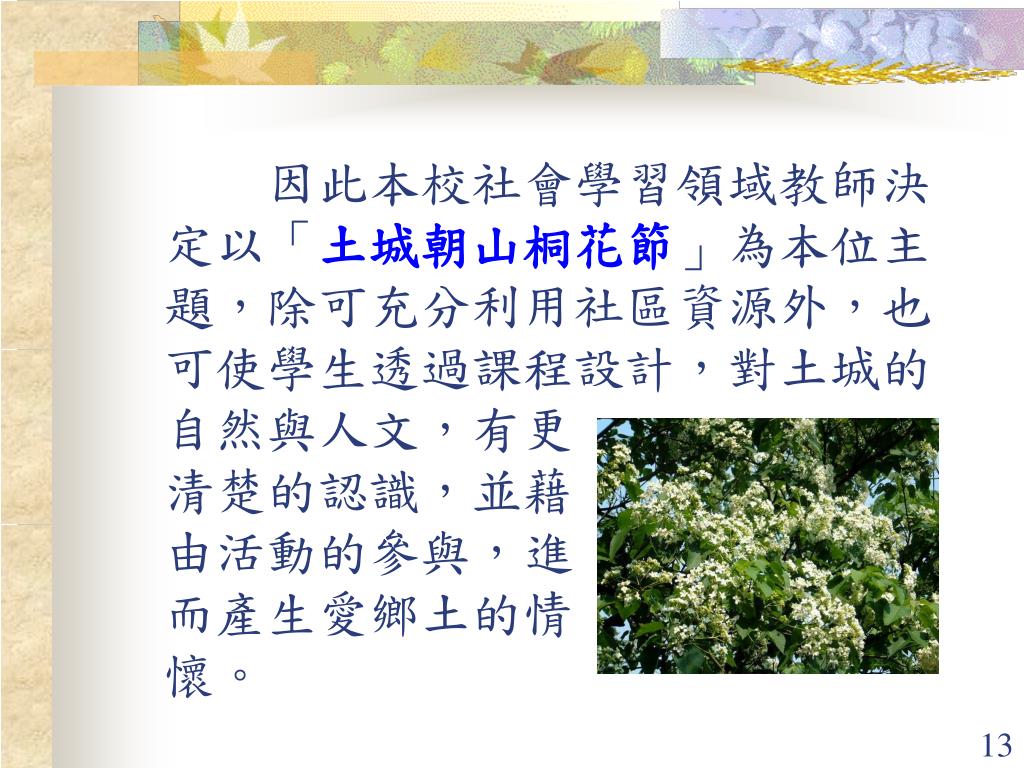 因此本校社會學習領域教師決定以「土城朝山桐花節」為本位主題,除可充分利用社區資源外,也可使學生透過課程設計,對土城的自然與人文,有更清楚的認識,並藉由活動的參與,進而產生愛鄉土的情懷。因此本校社會學習領域教師決定以「土城朝山桐花節」為本位主題,除可充分利用社區資源外,也可使學生透過課程設計,對土城的自然與人文,有更清楚的認識,並藉由活動的參與,進而產生愛鄉土的情懷。