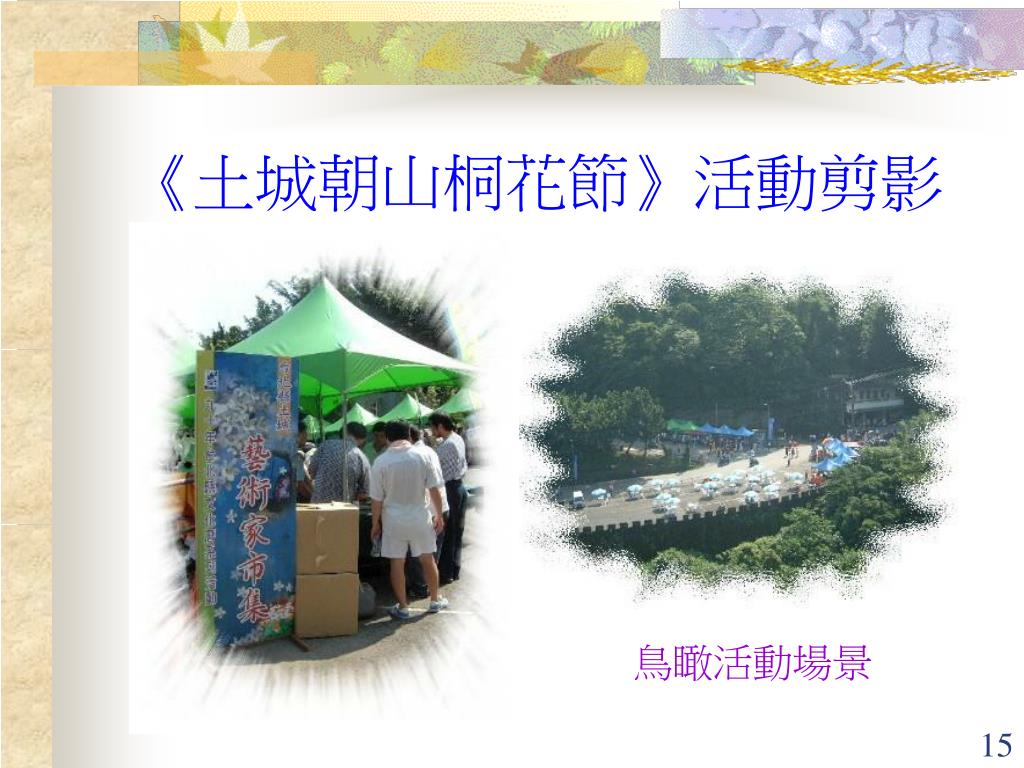土城朝山桐花節 • 實作暖身 1.九年一貫課程社會學習領域本位課程主題與目標 --以「土城朝山桐花節」為例 (鄭勝華教授) 2.分科蒐集資料 3.三科召集人下午茶對話 --整理資料及理念溝通 4.三位編輯及教具組夥伴實地走訪 --參與今年度「土城朝山桐花節」系列活動, 拍下珍貴鏡頭。