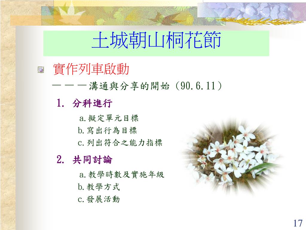 土城朝山桐花節 • 實作列車啟動 ---溝通與分享的開始 (90.6.11) 1. 分科進行 a.擬定單元目標 b.寫出行為目標 c.列出符合之能力指標 2. 共同討論 a.教學時數及實施年級 b.教學方式 c.發展活動