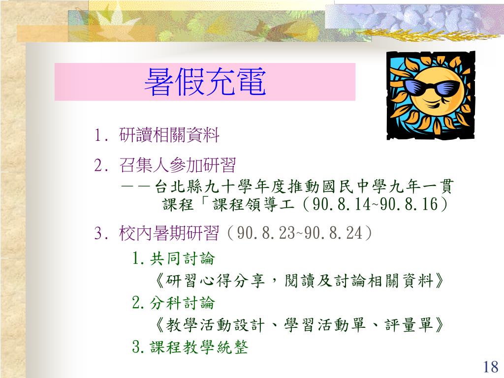 暑假充電 1. 研讀相關資料 2. 召集人參加研習 --台北縣九十學年度推動國民中學九年一貫 課程「課程領導工(90.8.14~90.8.16) 3. 校內暑期研習(90.8.23~90.8.24) 1.共同討論 《研習心得分享,閱讀及討論相關資料》 2.分科討論 《教學活動設計、學習活動單、評量單》 3.課程教學統整