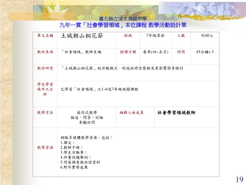 單元名稱 土城朝山桐花節 班級 7年級某班 人數 約40人 教材來源 「社會領域」教師自編 授課日期 春季(四~五月) 時間 45分鐘x 3 教材研究 「土城朝山桐花節」的活動模式,形成的時空歷程及其影響因素探討 學生學習條件之分析 已學習「社會領域」之1~6或7年級相關課程 教學方法 協同式教學 描述、問答、討論 參觀訪問 編輯小組成員 社會學習領域教師 教學資源 網路多媒體教學資源,包括: 1.課文; 2.教師手冊; 3.學生活動單; 4.評量試題舉例; 5.問卷調查與訪談資料 6.野外實察成果 臺北縣立清水高級中學 九年一貫「社會學習領域」本位課程 教學活動設計單