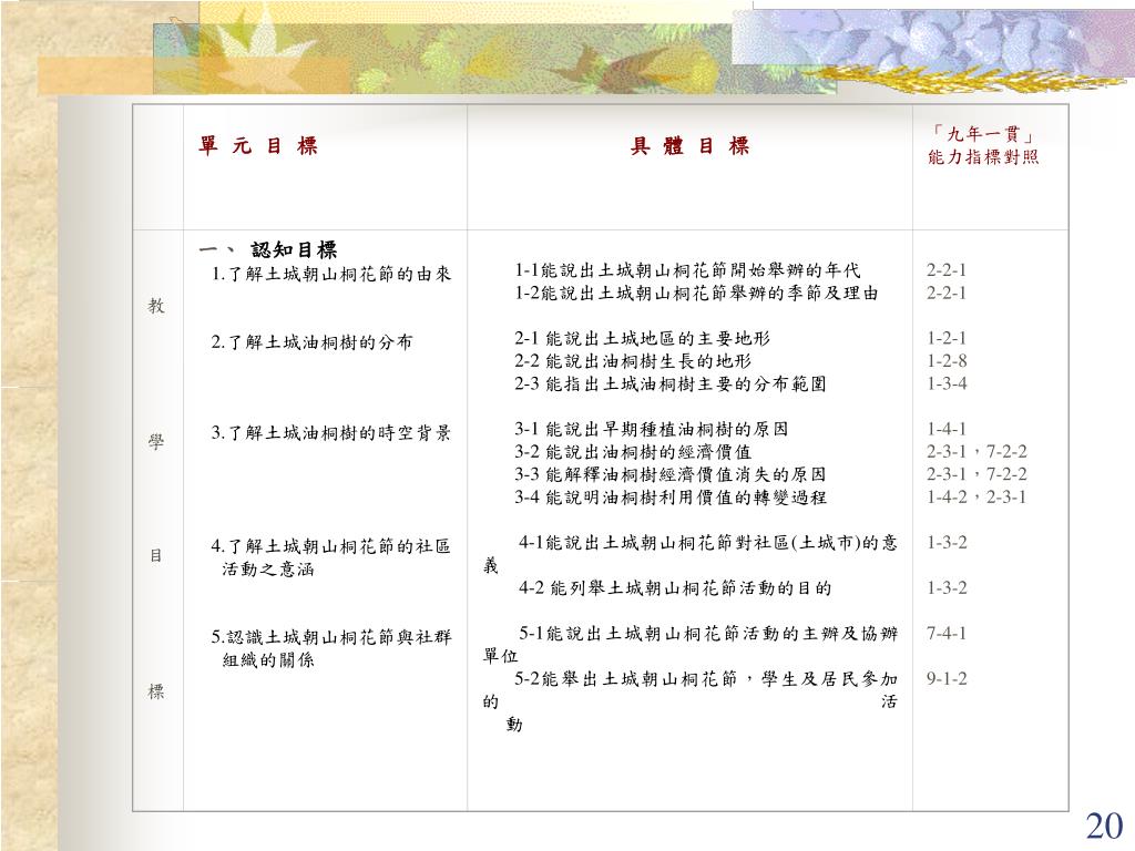 單 元 目 標 具 體 目 標 「九年一貫」 能力指標對照 教 學 目 標 一、認知目標 1.了解土城朝山桐花節的由來 2.了解土城油桐樹的分布 3.了解土城油桐樹的時空背景 4.了解土城朝山桐花節的社區 活動之意涵 5.認識土城朝山桐花節與社群 組織的關係 1-1能說出土城朝山桐花節開始舉辦的年代 1-2能說出土城朝山桐花節舉辦的季節及理由 2-1 能說出土城地區的主要地形 2-2 能說出油桐樹生長的地形 2-3 能指出土城油桐樹主要的分布範圍 3-1 能說出早期種植油桐樹的原因 3-2 能說出油桐樹的經濟價值 3-3 能解釋油桐樹經濟價值消失的原因 3-4 能說明油桐樹利用價值的轉變過程 4-1能說出土城朝山桐花節對社區(土城市)的意義 4-2 能列舉土城朝山桐花節活動的目的 5-1能說出土城朝山桐花節活動的主辦及協辦單位 5-2能舉出土城朝山桐花節,學生及居民參加的活 動 2-2-1 2-2-1 1-2-1 1-2-8 1-3-4 1-4-1 2-3-1,7-2-2 2-3-1,7-2-2 1-4-2,2-3-1 1-3-2 1-3-2 7-4-1 9-1-2