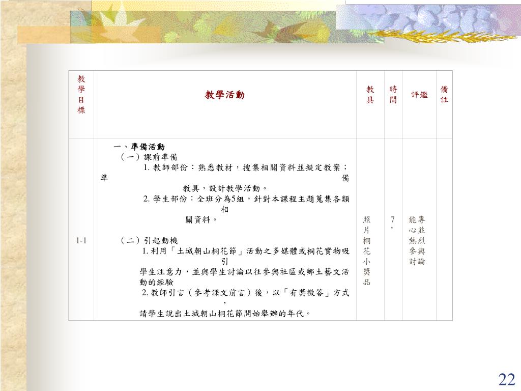 教學目標 教學活動 教具 時間 評鑑 備註 1-1 一、準備活動 (一)課前準備 1.教師部份:熟悉教材,搜集相關資料並擬定教案;準備 教具,設計教學活動。 2.學生部份:全班分為5組,針對本課程主題蒐集各類相 關資料。 (二)引起動機 1.利用「土城朝山桐花節」活動之多媒體或桐花實物吸引 學生注意力,並與學生討論以往參與社區或鄉土藝文活 動的經驗 2.教師引言(參考課文前言)後,以「有獎徵答」方式, 請學生說出土城朝山桐花節開始舉辦的年代。 照片 桐花 小獎品 7’ 能專心並熱烈參與討論