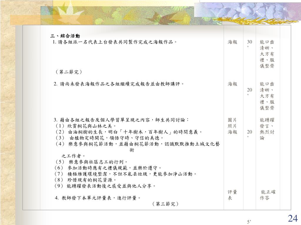 三、綜合活動 1.請各組派一名代表上台發表共同製作完成之海報作品。 (第二節完) 2.請尚未發表海報作品之各組繼續完成報告並由教師講評。 3.藉由各組之報告及個人學習單呈現之內容,師生共同討論: (1)欣賞桐花與山林之美。 (2)由油桐樹的生長,明白「十年樹木,百年樹人」的時間意義。 (3)由植物定時開花,領悟守時、守信的美德。 (4)樂意參與桐花節活動,並藉由桐花節活動,認識默默推動土城文化藝術 之工作者。 (5)樂意參與社區志工的行列。 (6)參加活動時應有之禮儀規範,並樂於遵守。 (7)積極維護環境整潔,不但不亂丟垃圾,更能參加淨山活動。 (8)珍惜現有的桐花資源。 (9)能踴躍發表活動後之感受並與他人分享。 4.教師發下本單元評量表,進行評量。 (第三節完) 海報 海報 圖片照片海報 評量表 30’ 20’ 20’ 5’ 能口齒清晰、大方有禮、服儀整齊 能口齒清晰、大方有禮、服儀整齊 能踴躍發言、熱烈討論 能正確作答