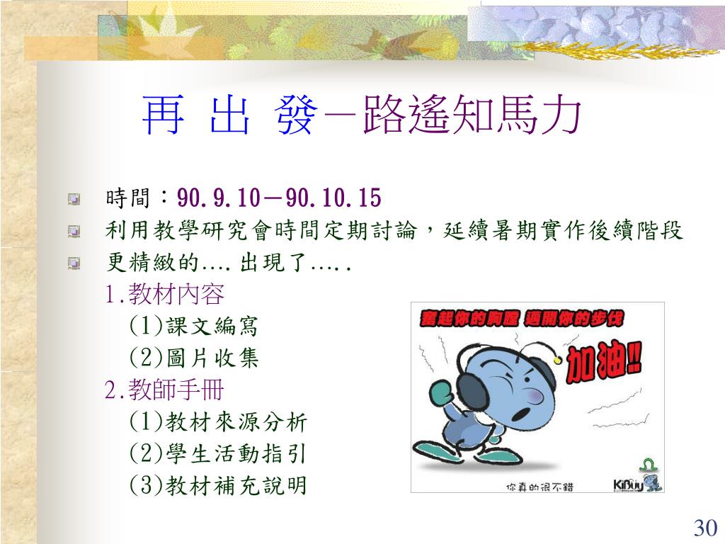 再 出 發-路遙知馬力 • 時間:90.9.10-90.10.15 • 利用教學研究會時間定期討論,延續暑期實作後續階段 • 更精緻的….出現了….. 1.教材內容 (1)課文編寫 (2)圖片收集 2.教師手冊 (1)教材來源分析 (2)學生活動指引 (3)教材補充說明