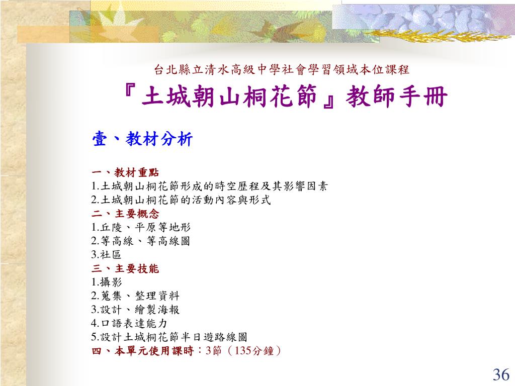 台北縣立清水高級中學社會學習領域本位課程 『土城朝山桐花節』教師手冊 壹、教材分析 一、教材重點 1.土城朝山桐花節形成的時空歷程及其影響因素 2.土城朝山桐花節的活動內容與形式 二、主要概念 1.丘陵、平原等地形 2.等高線、等高線圖 3.社區 三、主要技能 1.攝影 2.蒐集、整理資料 3.設計、繪製海報 4.口語表達能力 5.設計土城桐花節半日遊路線圖 四、本單元使用課時:3節(135分鐘)