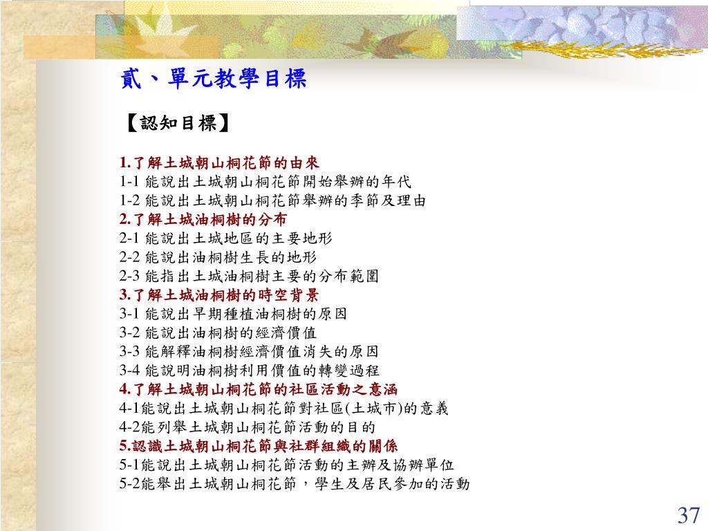 貳、單元教學目標 【認知目標】 1.了解土城朝山桐花節的由來 1-1 能說出土城朝山桐花節開始舉辦的年代 1-2 能說出土城朝山桐花節舉辦的季節及理由 2.了解土城油桐樹的分布 2-1 能說出土城地區的主要地形 2-2 能說出油桐樹生長的地形 2-3 能指出土城油桐樹主要的分布範圍 3.了解土城油桐樹的時空背景 3-1 能說出早期種植油桐樹的原因 3-2 能說出油桐樹的經濟價值 3-3 能解釋油桐樹經濟價值消失的原因 3-4 能說明油桐樹利用價值的轉變過程 4.了解土城朝山桐花節的社區活動之意涵 4-1能說出土城朝山桐花節對社區(土城市)的意義 4-2能列舉土城朝山桐花節活動的目的 5.認識土城朝山桐花節與社群組織的關係 5-1能說出土城朝山桐花節活動的主辦及協辦單位 5-2能舉出土城朝山桐花節,學生及居民參加的活動