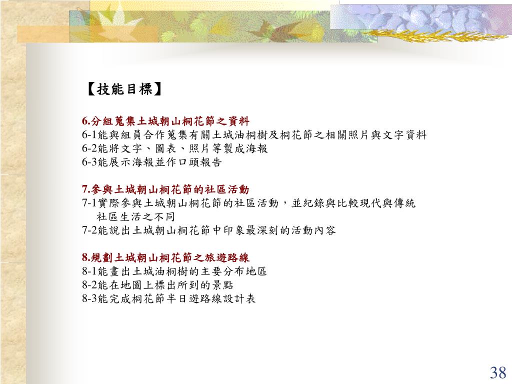 【技能目標】 6.分組蒐集土城朝山桐花節之資料 6-1能與組員合作蒐集有關土城油桐樹及桐花節之相關照片與文字資料 6-2能將文字、圖表、照片等製成海報 6-3能展示海報並作口頭報告 7.參與土城朝山桐花節的社區活動 7-1實際參與土城朝山桐花節的社區活動,並紀錄與比較現代與傳統 社區生活之不同 7-2能說出土城朝山桐花節中印象最深刻的活動內容 8.規劃土城朝山桐花節之旅遊路線 8-1能畫出土城油桐樹的主要分布地區 8-2能在地圖上標出所到的景點 8-3能完成桐花節半日遊路線設計表