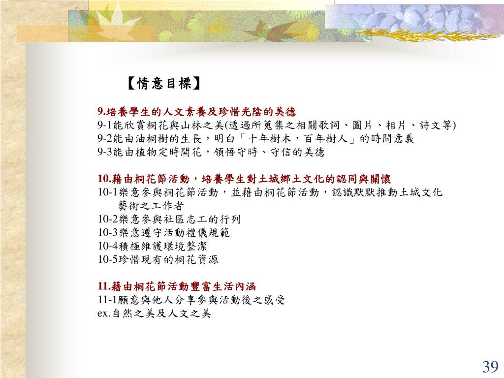 【情意目標】 9.培養學生的人文素養及珍惜光陰的美德 9-1能欣賞桐花與山林之美(透過所蒐集之相關歌詞、圖片、相片、詩文等) 9-2能由油桐樹的生長,明白「十年樹木,百年樹人」的時間意義 9-3能由植物定時開花,領悟守時、守信的美德 10.藉由桐花節活動,培養學生對土城鄉土文化的認同與關懷 10-1樂意參與桐花節活動,並藉由桐花節活動,認識默默推動土城文化 藝術之工作者 10-2樂意參與社區志工的行列 10-3樂意遵守活動禮儀規範 10-4積極維護環境整潔 10-5珍惜現有的桐花資源 11.藉由桐花節活動豐富生活內涵 11-1願意與他人分享參與活動後之感受 ex.自然之美及人文之美