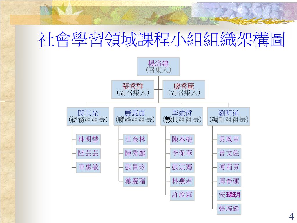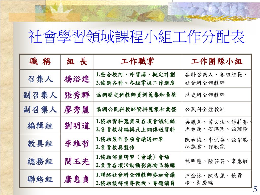 混沌期(89.5~90.2) • 九年一貫課程校內研習 • 九年一貫課程實施的背景、目標與精神內涵(陳伯璋教授) • 九年一貫課程實施的可能困境與解決策略(歐用生教授) • 課程統整的理念與模式(楊思偉教授) • 工作團隊的成立(89.11.23) --《社會學習領域課程小組》