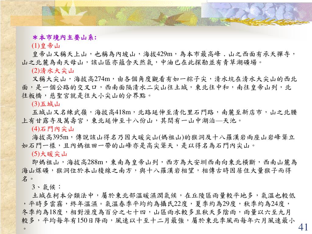 *本市境內主要山系: (1)皇帝山 皇帝山又稱天上山,也稱為內坡山,海拔429m,為本市最高峰﹒山之西面有承天禪寺,山之北麓為南天母山,該山區亦蘊含天然氣,中油已在此探勘並有青草湖礦場。 (2)清水大尖山 又稱大尖山,海拔高274m,由各個角度觀看有如一粽子尖,清水坑在清水大尖山的西北面,是一個公路的交叉口,西南面隔清水二尖山往土城,東北往中和,南往皇帝山列,北往板橋,慈聖宮就是往大小尖山的分界點。 (3)五城山 五城山又名練武嶺,海拔高418m,北路延伸至清化里石門路,南麓至新店市,山之北腰上有甘露寺及萬壽宮,東北延伸至十八份山,其間有一山中湖泊—天池。 (4)石門內尖山 海拔高395m,傳說該山得名乃因大暖尖山(媽祖山)的猴洞及十八羅漢岩兩座山岩峰聳立如石門一樣,且內媽祖田一帶的山峰亦是高尖聳天,是以得名為石門內尖山。 (5)大暖尖山 即媽祖山,海拔高288m,東南為皇帝山列,西方為大安圳西南向東北橫斷,西南山麓為海山煤礦,猴洞位於本山稜線之南方,與十八羅漢岩相望,相傳古時因居住大量猴子而得名。 3、氣候: 土城在柯本分類法中,屬於東北部溫暖濕潤氣候,在丘陵區雨量較平地多,氣溫也較低,平時多雲霧,終年溫濕。氣溫春季平均約為攝氏22度,夏季約為29度,秋季約為24度,冬季約為18度,相對溼度為百分之七十四,山區雨水較多且秋天多陰雨,雨量以六至九月較多,平均每年有150日降雨,風速以十至十二月最強,屬於東北季風而每年六月風速最小。