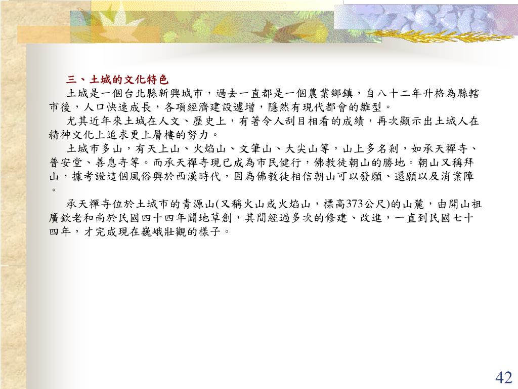三、土城的文化特色 土城是一個台北縣新興城市,過去一直都是一個農業鄉鎮,自八十二年升格為縣轄市後,人口快速成長,各項經濟建設遽增,隱然有現代都會的雛型。 尤其近年來土城在人文、歷史上,有著令人刮目相看的成績,再次顯示出土城人在精神文化上追求更上層樓的努力。 土城市多山,有天上山、火焰山、文筆山、大尖山等,山上多名剎,如承天禪寺、普安堂、善息寺等。而承天禪寺現已成為市民健行,佛教徒朝山的勝地。朝山又稱拜山,據考證這個風俗興於西漢時代,因為佛教徒相信朝山可以發願、還願以及消業障。 承天禪寺位於土城市的青源山(又稱火山或火焰山,標高373公尺)的山麓,由開山祖廣欽老和尚於民國四十四年闢地草創,其間經過多次的修建、改進,一直到民國七十四年,才完成現在巍峨壯觀的樣子。