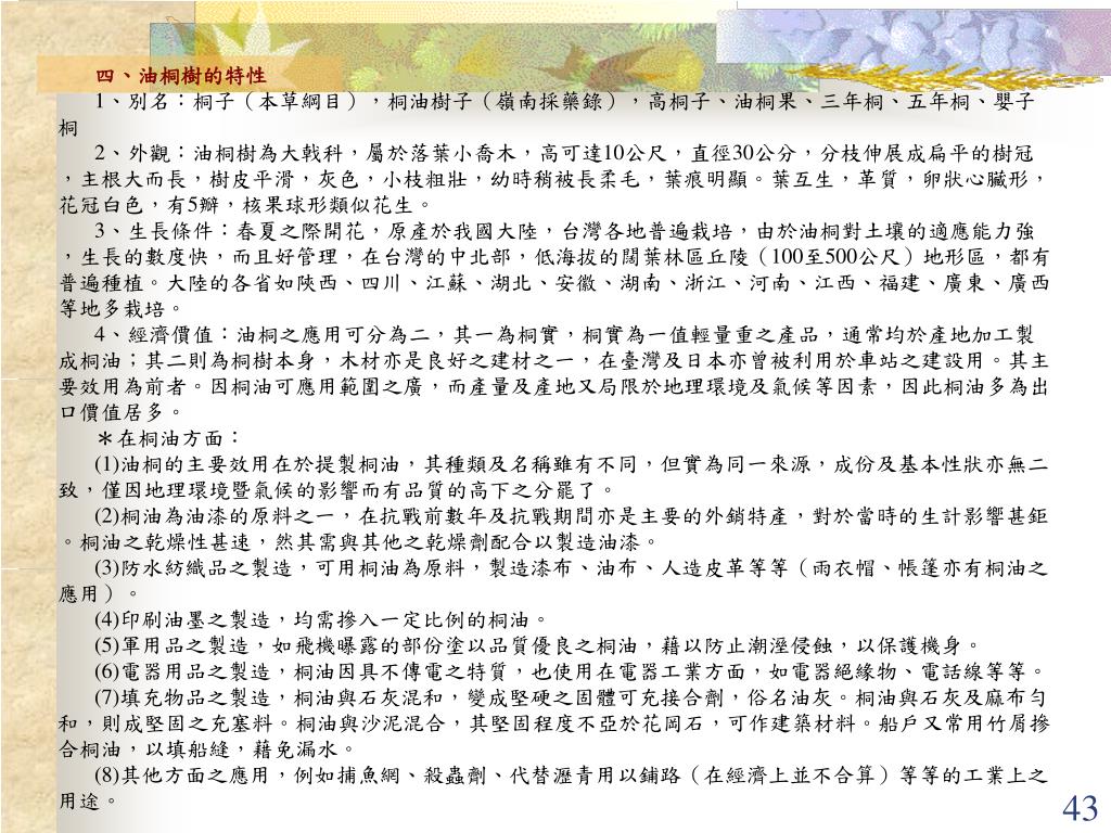 四、油桐樹的特性 1、別名:桐子(本草綱目),桐油樹子(嶺南採藥錄),高桐子、油桐果、三年桐、五年桐、嬰子桐 2、外觀:油桐樹為大戟科,屬於落葉小喬木,高可達10公尺,直徑30公分,分枝伸展成扁平的樹冠,主根大而長,樹皮平滑,灰色,小枝粗壯,幼時稍被長柔毛,葉痕明顯。葉互生,革質,卵狀心臟形,花冠白色,有5瓣,核果球形類似花生。 3、生長條件:春夏之際開花,原產於我國大陸,台灣各地普遍栽培,由於油桐對土壤的適應能力強,生長的數度快,而且好管理,在台灣的中北部,低海拔的闊葉林區丘陵(100至500公尺)地形區,都有普遍種植。大陸的各省如陜西、四川、江蘇、湖北、安徽、湖南、浙江、河南、江西、福建、廣東、廣西等地多栽培。 4、經濟價值:油桐之應用可分為二,其一為桐實,桐實為一值輕量重之產品,通常均於產地加工製成桐油;其二則為桐樹本身,木材亦是良好之建材之一,在臺灣及日本亦曾被利用於車站之建設用。其主要效用為前者。因桐油可應用範圍之廣,而產量及產地又局限於地理環境及氣候等因素,因此桐油多為出口價值居多。 *在桐油方面: (1)油桐的主要效用在於提製桐油,其種類及名稱雖有不同,但實為同一來源,成份及基本性狀亦無二致,僅因地理環境暨氣候的影響而有品質的高下之分罷了。 (2)桐油為油漆的原料之一,在抗戰前數年及抗戰期間亦是主要的外銷特產,對於當時的生計影響甚鉅。桐油之乾燥性甚速,然其需與其他之乾燥劑配合以製造油漆。 (3)防水紡織品之製造,可用桐油為原料,製造漆布、油布、人造皮革等等(雨衣帽、帳篷亦有桐油之應用)。 (4)印刷油墨之製造,均需摻入一定比例的桐油。 (5)軍用品之製造,如飛機曝露的部份塗以品質優良之桐油,藉以防止潮溼侵蝕,以保護機身。 (6)電器用品之製造,桐油因具不傳電之特質,也使用在電器工業方面,如電器絕緣物、電話線等等。 (7)填充物品之製造,桐油與石灰混和,變成堅硬之固體可充接合劑,俗名油灰。桐油與石灰及麻布勻和,則成堅固之充塞料。桐油與沙泥混合,其堅固程度不亞於花岡石,可作建築材料。船戶又常用竹屑摻合桐油,以填船縫,藉免漏水。 (8)其他方面之應用,例如捕魚網、殺蟲劑、代替瀝青用以鋪路(在經濟上並不合算)等等的工業上之用途。
