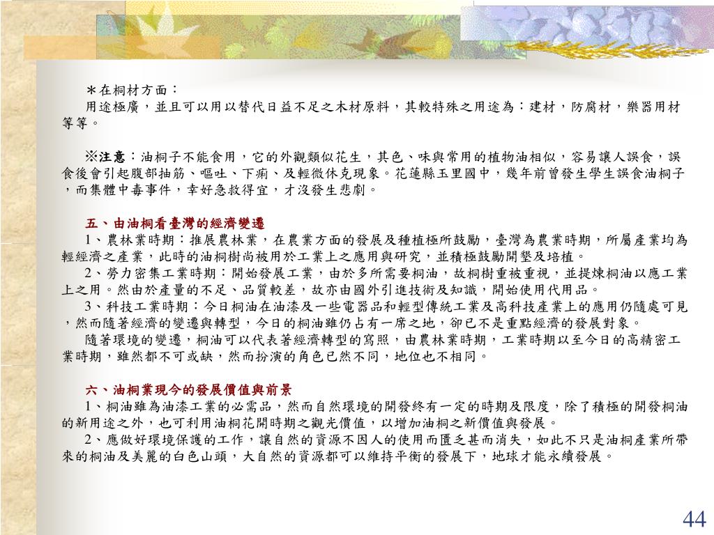 *在桐材方面: 用途極廣,並且可以用以替代日益不足之木材原料,其較特殊之用途為:建材,防腐材,樂器用材等等。 ※注意:油桐子不能食用,它的外觀類似花生,其色、味與常用的植物油相似,容易讓人誤食,誤食後會引起腹部抽筋、嘔吐、下痢、及輕微休克現象。花蓮縣玉里國中,幾年前曾發生學生誤食油桐子,而集體中毒事件,幸好急救得宜,才沒發生悲劇。 五、由油桐看臺灣的經濟變遷 1、農林業時期:推展農林業,在農業方面的發展及種植極所鼓勵,臺灣為農業時期,所屬產業均為輕經濟之產業,此時的油桐樹尚被用於工業上之應用與研究,並積極鼓勵開墾及培植。 2、勞力密集工業時期:開始發展工業,由於多所需要桐油,故桐樹重被重視,並提煉桐油以應工業上之用。然由於產量的不足、品質較差,故亦由國外引進技術及知識,開始使用代用品。 3、科技工業時期:今日桐油在油漆及一些電器品和輕型傳統工業及高科技產業上的應用仍隨處可見,然而隨著經濟的變遷與轉型,今日的桐油雖仍占有一席之地,卻已不是重點經濟的發展對象。 隨著環境的變遷,桐油可以代表著經濟轉型的寫照,由農林業時期,工業時期以至今日的高精密工業時期,雖然都不可或缺,然而扮演的角色已然不同,地位也不相同。 六、油桐業現今的發展價值與前景 1、桐油雖為油漆工業的必需品,然而自然環境的開發終有一定的時期及限度,除了積極的開發桐油的新用途之外,也可利用油桐花開時期之觀光價值,以增加油桐之新價值與發展。 2、應做好環境保護的工作,讓自然的資源不因人的使用而匱乏甚而消失,如此不只是油桐產業所帶來的桐油及美麗的白色山頭,大自然的資源都可以維持平衡的發展下,地球才能永續發展。