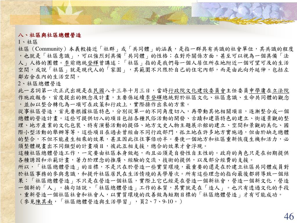 八、社區與社區總體營造 1、社區 社區(Community)本義較接近「社群」或「共同體」的涵義,是指一群具有共識的社會單位,其共識的程度,也就是「社區意識」,可以強烈到具備「共同體」的性格;在對外關係方面,甚至可以視為一個具備「法人」人格的團體。李前總統登輝曾講述:「社區」指的是我們每一個人居住所在地附近一個可望可及的生活空間,或說「社區」就是現代人的「家園」,其範圍不只限於自己的住宅內部,而是由此向外延伸,包括左鄰右舍在內的生活空間。 2、社區總體營造 此一名詞第一次正式出現是在民國八十三年十月三日,當時行政院文化建設委員會主任委員申學庸在立法院作施政報告,首度提出的概念及計畫,主要係延續李登輝總統對於社區文化、社區意識、生命共同體的觀念,並加以整合轉化為一項可在政策和行政上,實際操作出來的方案。 從事社區營造,首先要根據社區特色,分別從單一的不同角度切入,再帶動其他相關項目,逐漸整合成一個總體的營造計畫。這些可提供切入的項目包括各種民俗活動的開發、古蹟和建築特色的建立、街道景觀的整理、地方產業的文化包裝、特有演藝活動的提倡、地方文史人物主題展示館的建立、空間和景觀的美化、國際小型活動的舉辦等等。這些項目在過去曾經由不同行政部門,孤立地在許多地方實施過,但由於缺乏總體的整合,不但不能產生相乘的效果,甚且因此往往事倍功半。要使一個地方和社區重新恢復生機和活力,必須整體規畫出不同類型的計畫項目,彼此互相支援,總合的效果才會浮現。 這種社區總體營造工作,一定要由社區本身做起,而且必須是自發性自主性的。政府的角色只是在初期提供各種誘因和示範計畫,著力於理念的推廣、經驗的交流、技術的提供,以及部分經費的支援。 所以,「社區總體營造」的目標,不是只在於營造一些實質環境,最重要的還是在於建立社區共同體成員對於社區事務的參與意識,和提升社區居民在生活情境的美學層次。所有這些理念的指向最後都將導致一個結果:「社區總體營造」不只是在營造一個社區,實際上它已經是在營造一個新社會,營造一個新文化,營造一個新的「人」。換句話說,「社區總體營造」工作的本質,其實就是在「造人」。也只有透過文化的手段,重新營造一個社區社會和社會人,以實質環境的改善做為短期目標的「社區總體營造」才有可能成功。 (參見陳其南,「社區總體營造與生活學習」,頁2、7、9-10。)