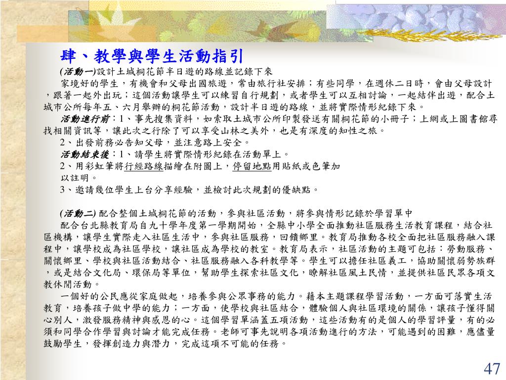 肆、教學與學生活動指引 (活動一)設計土城桐花節半日遊的路線並記錄下來 家境好的學生,有機會和父母出國旅遊,常由旅行社安排;有些同學,在週休二日時,會由父母設計,跟著一起外出玩;這個活動讓學生可以練習自行規劃,或者學生可以互相討論,一起結伴出遊,配合土城市公所每年五、六月舉辦的桐花節活動,設計半日遊的路線,並將實際情形紀錄下來。 活動進行前:1、事先搜集資料,如索取土城市公所印製發送有關桐花節的小冊子;上網或上圖書館尋找相關資訊等,讓此次之行除了可以享受山林之美外,也是有深度的知性之旅。 2、出發前務必告知父母,並注意路上安全。 活動結束後:1、請學生將實際情形紀錄在活動單上。 2、用彩虹筆將行經路線描繪在附圖上,停留地點用貼紙或色筆加 以註明。 3、邀請幾位學生上台分享經驗,並檢討此次規劃的優缺點。 (活動二)配合整個土城桐花節的活動,參與社區活動,將參與情形記錄於學習單中 配合台北縣教育局自九十學年度第一學期開始,全縣中小學全面推動社區服務生活教育課程,結合社區機構,讓學生實際走入社區生活中,參與社區服務,回饋鄉里。教育局推動各校全面把社區服務融入課程中,讓學校成為社區學校,讓社區成為學校的教室。教育局表示,社區活動的主題可包括:勞動服務、關懷鄉里、學校與社區活動結合、社區服務融入各科教學等。學生可以擔任社區義工,協助關懷弱勢族群,或是結合文化局、環保局等單位,幫助學生探索社區文化,瞭解社區風土民情,並提供社區民眾各項文教休閒活動。 一個好的公民應從家庭做起,培養參與公眾事務的能力。藉本主題課程學習活動,一方面可落實生活教育,培養孩子做中學的能力;一方面,使學校與社區結合,體驗個人與社區環境的關係,讓孩子懂得關心別人,激發服務精神與感恩的心。這個學習單涵蓋五項活動,這些活動有的是個人的學習評量,有的必須和同學合作學習與討論才能完成任務。老師可事先說明各項活動進行的方法,可能遇到的困難,應儘量鼓勵學生,發揮創造力與潛力,完成這項不可能的任務。
