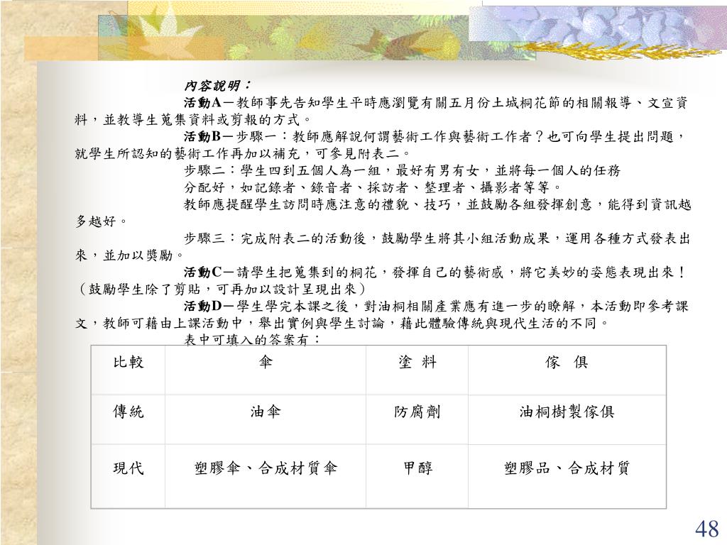傢 俱 比較 傘 塗料 油桐樹製傢俱 傳統 油傘 防腐劑 塑膠品、合成材質 現代 塑膠傘、合成材質傘 甲醇 內容說明: 活動A-教師事先告知學生平時應瀏覽有關五月份土城桐花節的相關報導、文宣資料,並教導生蒐集資料或剪報的方式。 活動B-步驟一:教師應解說何謂藝術工作與藝術工作者?也可向學生提出問題,就學生所認知的藝術工作再加以補充,可參見附表二。 步驟二:學生四到五個人為一組,最好有男有女,並將每一個人的任務 分配好,如記錄者、錄音者、採訪者、整理者、攝影者等等。 教師應提醒學生訪問時應注意的禮貌、技巧,並鼓勵各組發揮創意,能得到資訊越多越好。 步驟三:完成附表二的活動後,鼓勵學生將其小組活動成果,運用各種方式發表出來,並加以獎勵。 活動C-請學生把蒐集到的桐花,發揮自己的藝術感,將它美妙的姿態表現出來!(鼓勵學生除了剪貼,可再加以設計呈現出來) 活動D-學生學完本課之後,對油桐相關產業應有進一步的瞭解,本活動即參考課文,教師可藉由上課活動中,舉出實例與學生討論,藉此體驗傳統與現代生活的不同。 表中可填入的答案有: