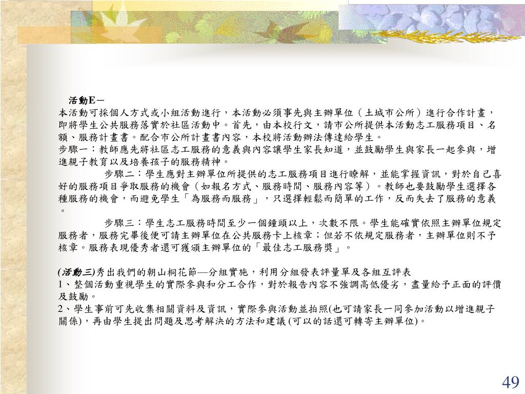 活動E- 本活動可採個人方式或小組活動進行,本活動必須事先與主辦單位(土城市公所)進行合作計畫,即將學生公共服務落實於社區活動中。首先,由本校行文,請市公所提供本活動志工服務項目、名額、服務計畫書。配合市公所計畫書內容,本校將活動辦法傳達給學生。 步驟一:教師應先將社區志工服務的意義與內容讓學生家長知道,並鼓勵學生與家長一起參與,增進親子教育以及培養孩子的服務精神。 步驟二:學生應對主辦單位所提供的志工服務項目進行瞭解,並能掌握資訊,對於自己喜好的服務項目爭取服務的機會(如報名方式、服務時間、服務內容等)。教師也要鼓勵學生選擇各種服務的機會,而避免學生「為服務而服務」,只選擇輕鬆而簡單的工作,反而失去了服務的意義。 步驟三:學生志工服務時間至少一個鐘頭以上,次數不限。學生能確實依照主辦單位規定服務者,服務完畢後便可請主辦單位在公共服務卡上核章;但若不依規定服務者,主辦單位則不予核章。服務表現優秀者還可獲頒主辦單位的「最佳志工服務獎」。 (活動三)秀出我們的朝山桐花節—分組實施,利用分組發表評量單及各組互評表 1、整個活動重視學生的實際參與和分工合作,對於報告內容不強調高低優劣,盡量給予正面的評價及鼓勵。 2、學生事前可先收集相關資料及資訊,實際參與活動並拍照(也可請家長一同參加活動以增進親子關係),再由學生提出問題及思考解決的方法和建議 (可以的話還可轉寄主辦單位)。