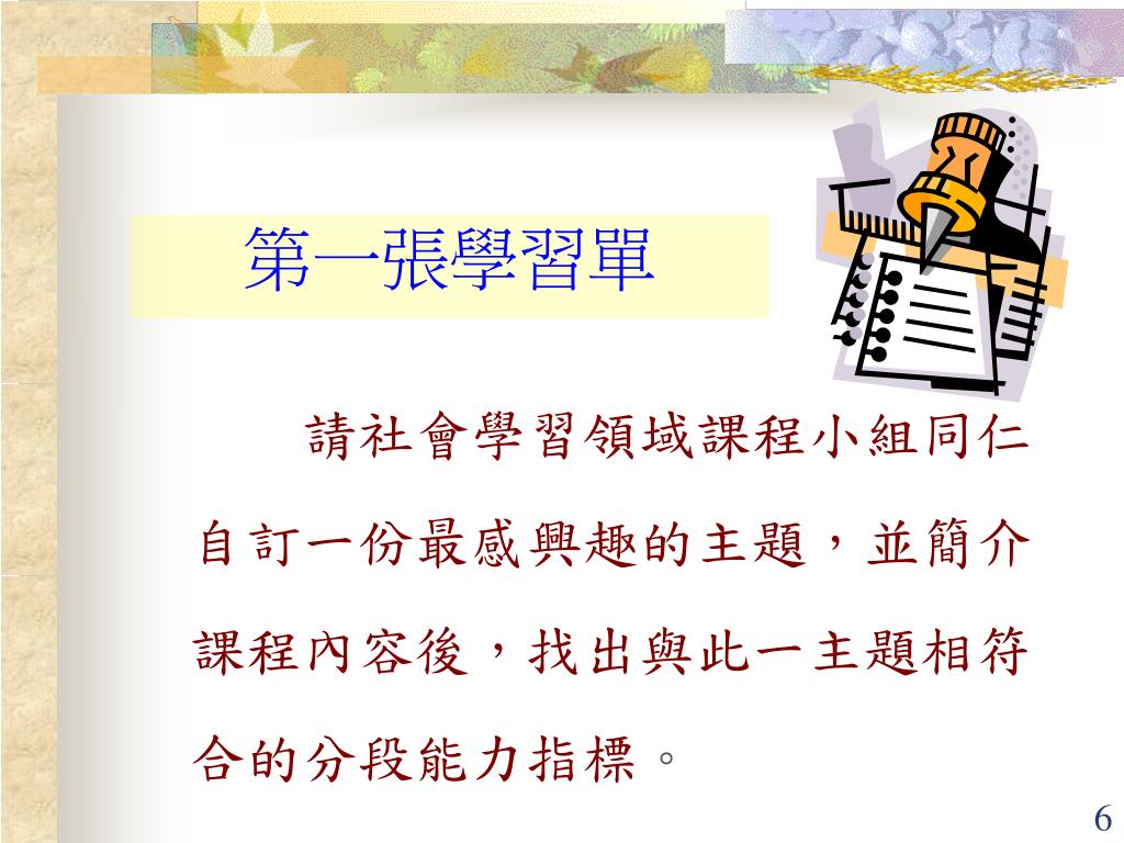 第一張學習單 請社會學習領域課程小組同仁自訂一份最感興趣的主題,並簡介課程內容後,找出與此一主題相符合的分段能力指標。
