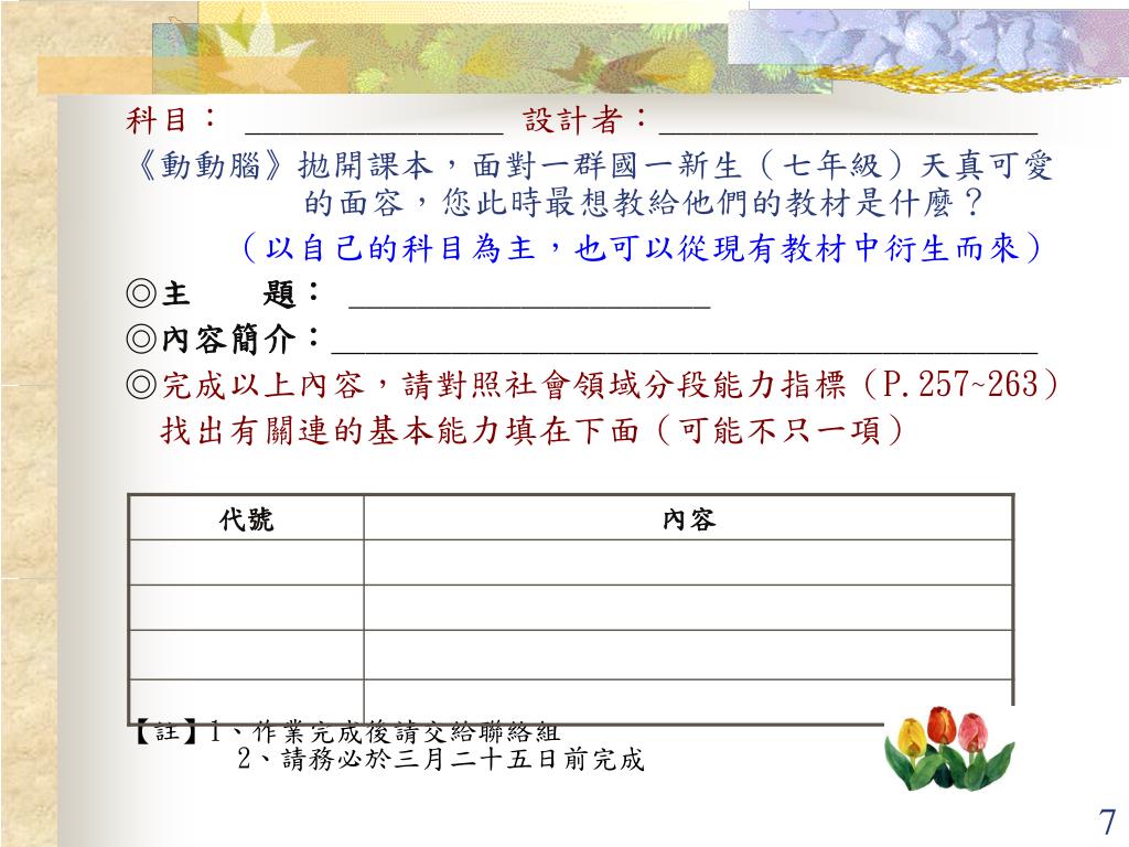科目: _______________設計者:______________________ 《動動腦》拋開課本,面對一群國一新生(七年級)天真可愛 的面容,您此時最想教給他們的教材是什麼? (以自己的科目為主,也可以從現有教材中衍生而來) ◎主 題:_____________________ ◎內容簡介:_________________________________________ ◎完成以上內容,請對照社會領域分段能力指標(P.257~263) 找出有關連的基本能力填在下面(可能不只一項) 【註】1、作業完成後請交給聯絡組 2、請務必於三月二十五日前完成