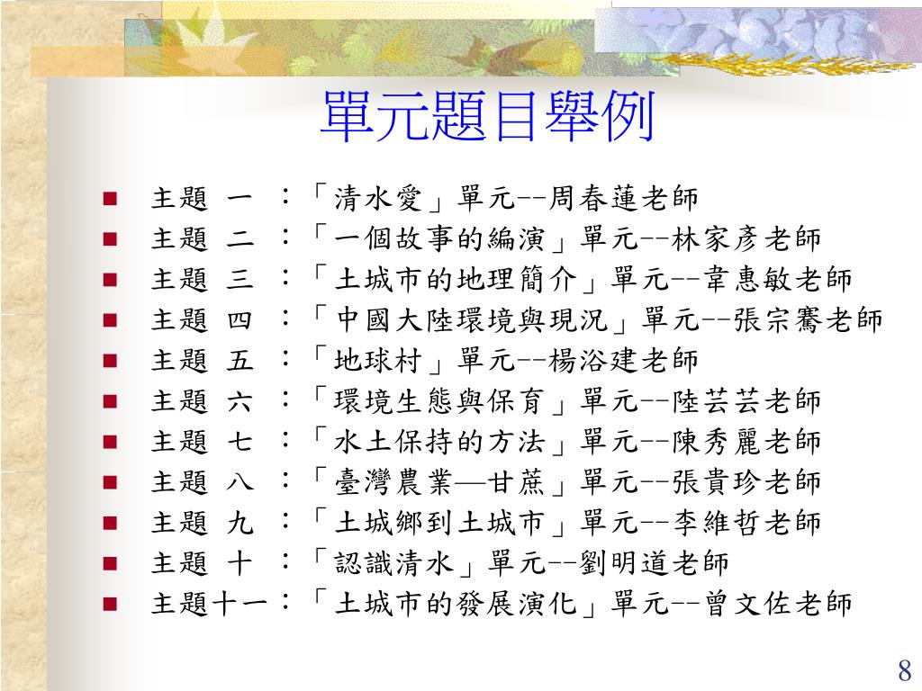 單元題目舉例 • 主題 一 :「清水愛」單元--周春蓮老師 • 主題 二 :「一個故事的編演」單元--林家彥老師 • 主題 三 :「土城市的地理簡介」單元--韋惠敏老師 • 主題 四 :「中國大陸環境與現況」單元--張宗騫老師 • 主題 五 :「地球村」單元--楊浴建老師 • 主題 六 :「環境生態與保育」單元--陸芸芸老師 • 主題 七 :「水土保持的方法」單元--陳秀麗老師 • 主題 八 :「臺灣農業—甘蔗」單元--張貴珍老師 • 主題 九 :「土城鄉到土城市」單元--李維哲老師 • 主題 十 :「認識清水」單元--劉明道老師 • 主題十一:「土城市的發展演化」單元--曾文佐老師