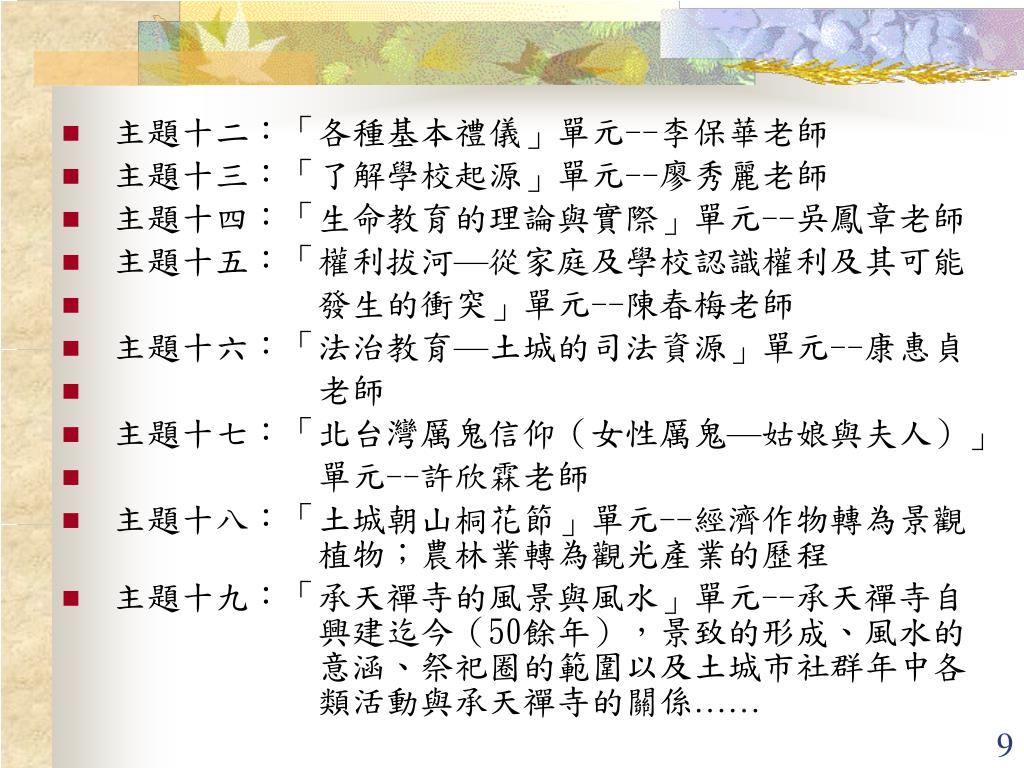 主題十二:「各種基本禮儀」單元--李保華老師主題十二:「各種基本禮儀」單元--李保華老師 • 主題十三:「了解學校起源」單元--廖秀麗老師 • 主題十四:「生命教育的理論與實際」單元--吳鳳章老師 • 主題十五:「權利拔河—從家庭及學校認識權利及其可能 • 發生的衝突」單元--陳春梅老師 • 主題十六:「法治教育—土城的司法資源」單元--康惠貞 • 老師 • 主題十七:「北台灣厲鬼信仰(女性厲鬼—姑娘與夫人)」 • 單元--許欣霖老師 • 主題十八:「土城朝山桐花節」單元--經濟作物轉為景觀 植物;農林業轉為觀光產業的歷程 • 主題十九:「承天禪寺的風景與風水」單元--承天禪寺自 興建迄今(50餘年),景致的形成、風水的 意涵、祭祀圈的範圍以及土城市社群年中各 類活動與承天禪寺的關係……