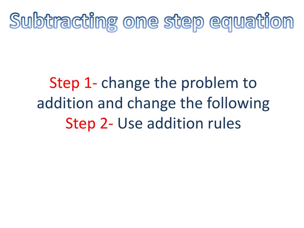 Subtracting one step equation Step 1- change the problem to addition and change the following Step 2- Use addition rules