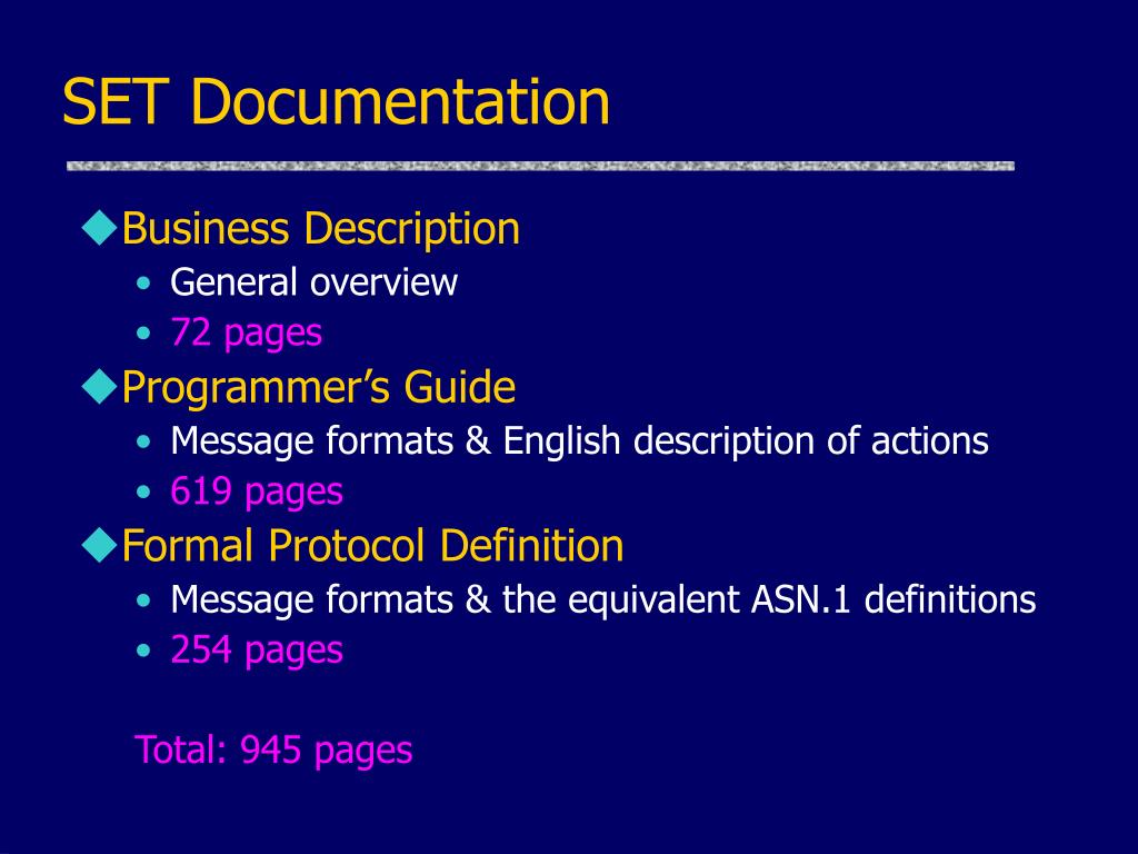 SET Documentation • Business Description • General overview • 72 pages • Programmer’s Guide • Message formats & English description of actions • 619 pages • Formal Protocol Definition • Message formats & the equivalent ASN.1 definitions • 254 pages Total: 945 pages