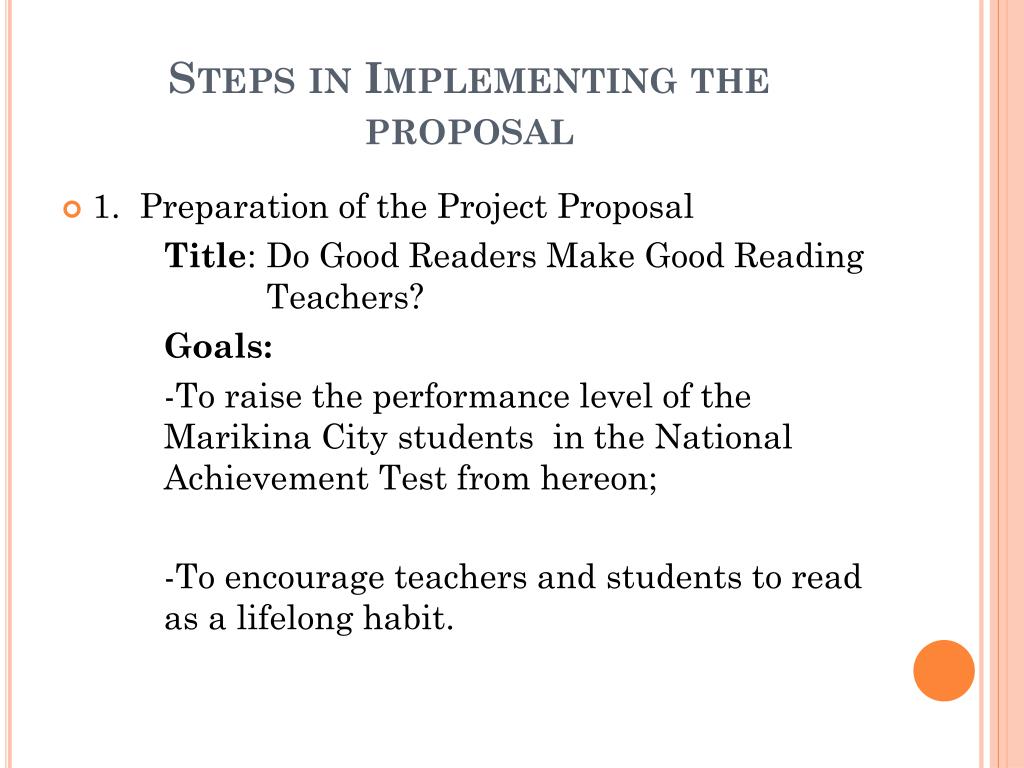 Steps in Implementing the proposal • 1. Preparation of the Project Proposal Title: Do Good Readers Make Good Reading Teachers? Goals: -To raise the performance level of the Marikina City students in the National Achievement Test from hereon; -To encourage teachers and students to read as a lifelong habit.