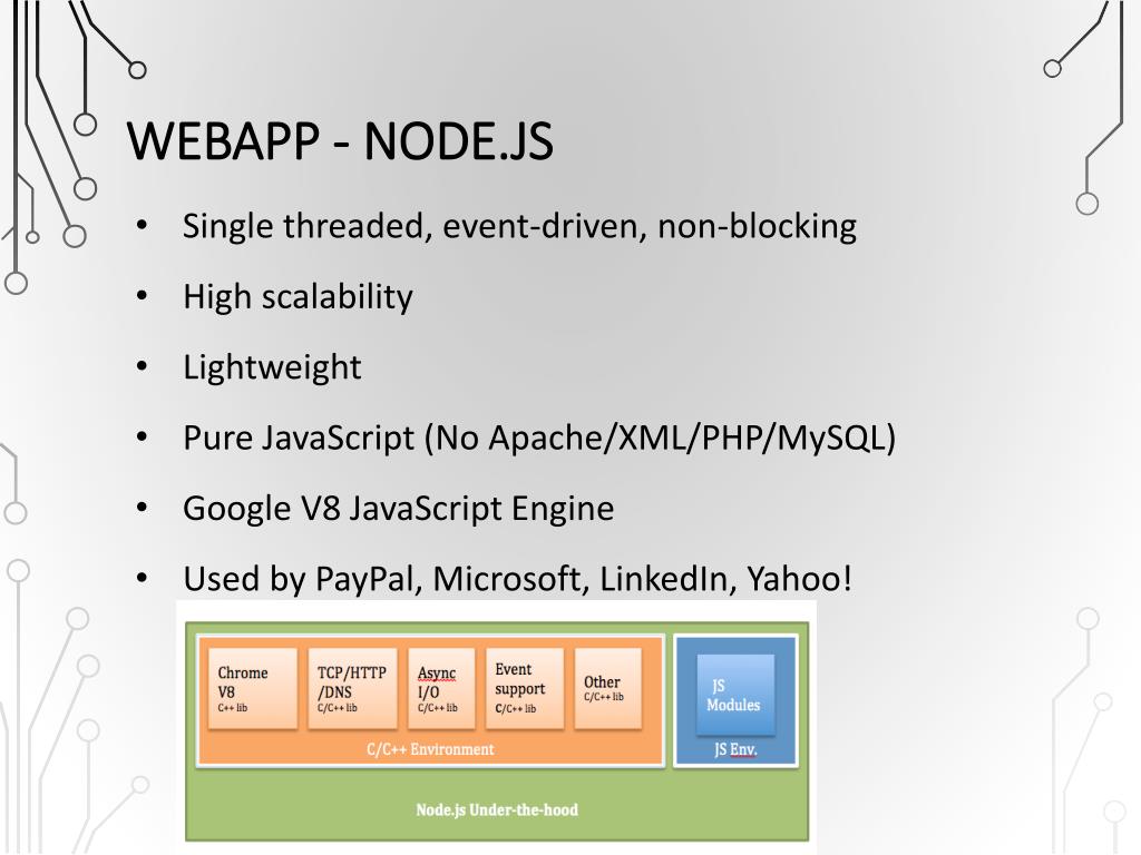 WebApp - Node.js • Single threaded, event-driven, non-blocking • High scalability • Lightweight • Pure JavaScript (No Apache/XML/PHP/MySQL) • Google V8 JavaScript Engine • Used by PayPal, Microsoft, LinkedIn, Yahoo!