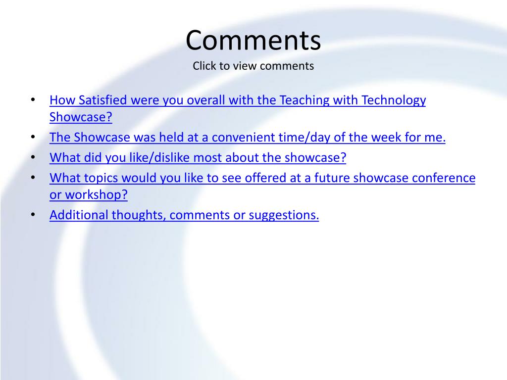 CommentsClick to view comments • How Satisfied were you overall with the Teaching with Technology Showcase? • The Showcase was held at a convenient time/day of the week for me. • What did you like/dislike most about the showcase? • What topics would you like to see offered at a future showcase conference or workshop? • Additional thoughts, comments or suggestions.