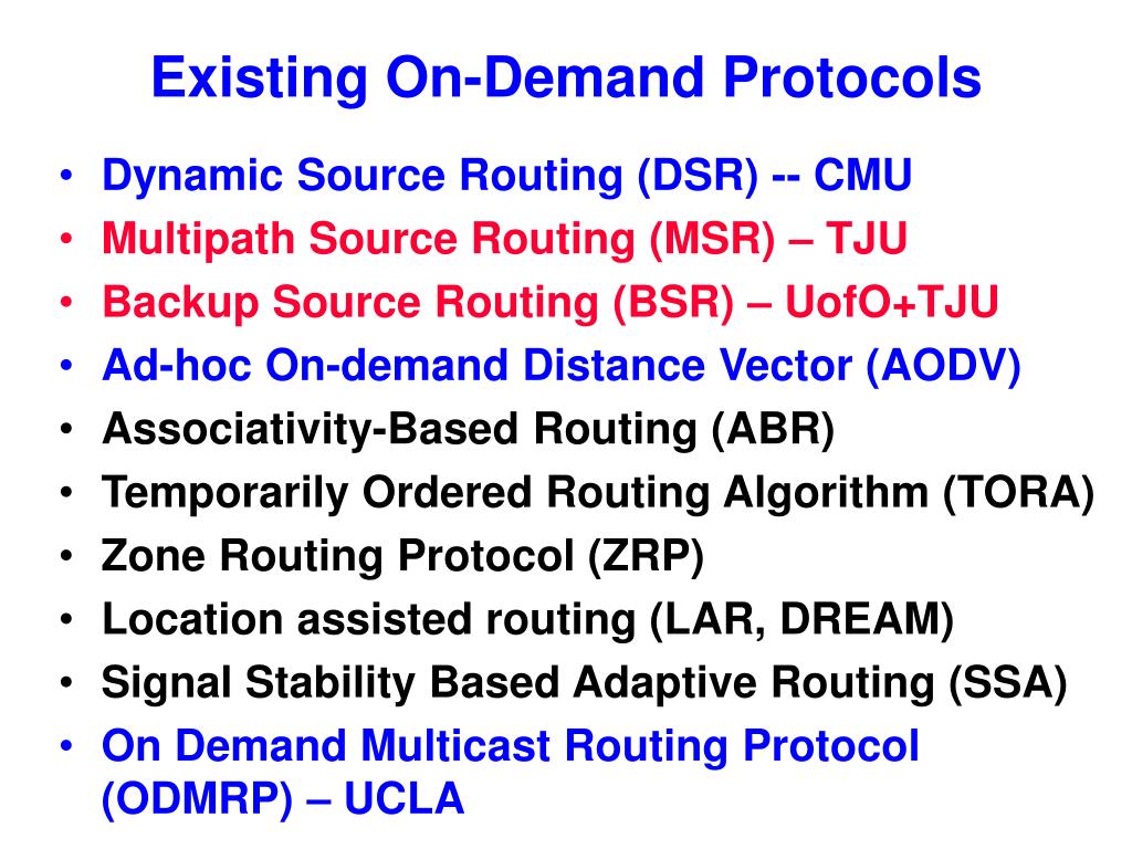 Existing On-Demand Protocols • Dynamic Source Routing (DSR) -- CMU • Multipath Source Routing (MSR) – TJU • Backup Source Routing (BSR) – UofO+TJU • Ad-hoc On-demand Distance Vector (AODV) • Associativity-Based Routing (ABR) • Temporarily Ordered Routing Algorithm (TORA) • Zone Routing Protocol (ZRP) • Location assisted routing (LAR, DREAM) • Signal Stability Based Adaptive Routing (SSA) • On Demand Multicast Routing Protocol (ODMRP) – UCLA
