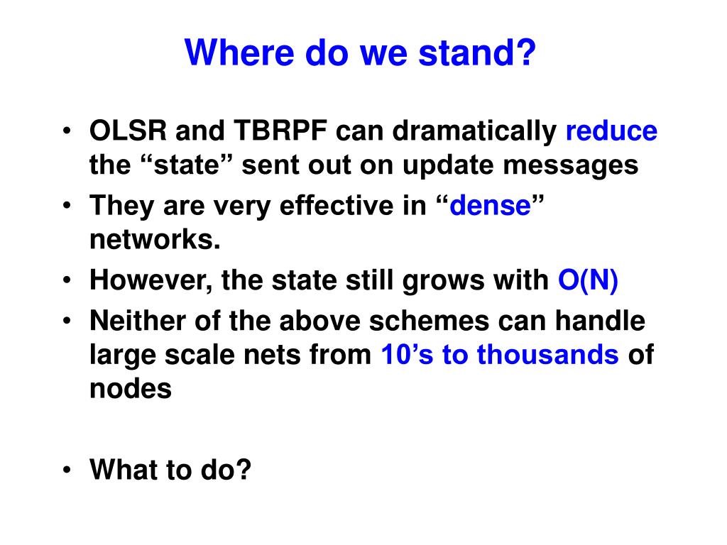 Where do we stand? • OLSR and TBRPF can dramatically reduce the “state” sent out on update messages • They are very effective in “dense” networks. • However, the state still grows with O(N) • Neither of the above schemes can handle large scale nets from 10’s to thousands of nodes • What to do?