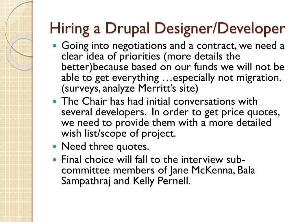 Hiring a Drupal Designer/Developer • Going into negotiations and a contract, we need a clear idea of priorities (more details the better)because based on our funds we will not be able to get everything …especially not migration. (surveys, analyze Merritt’s site) • The Chair has had initial conversations with several developers. In order to get price quotes, we need to provide them with a more detailed wish list/scope of project. • Need three quotes. • Final choice will fall to the interview sub-committee members of Jane McKenna, BalaSampathraj and Kelly Pernell.