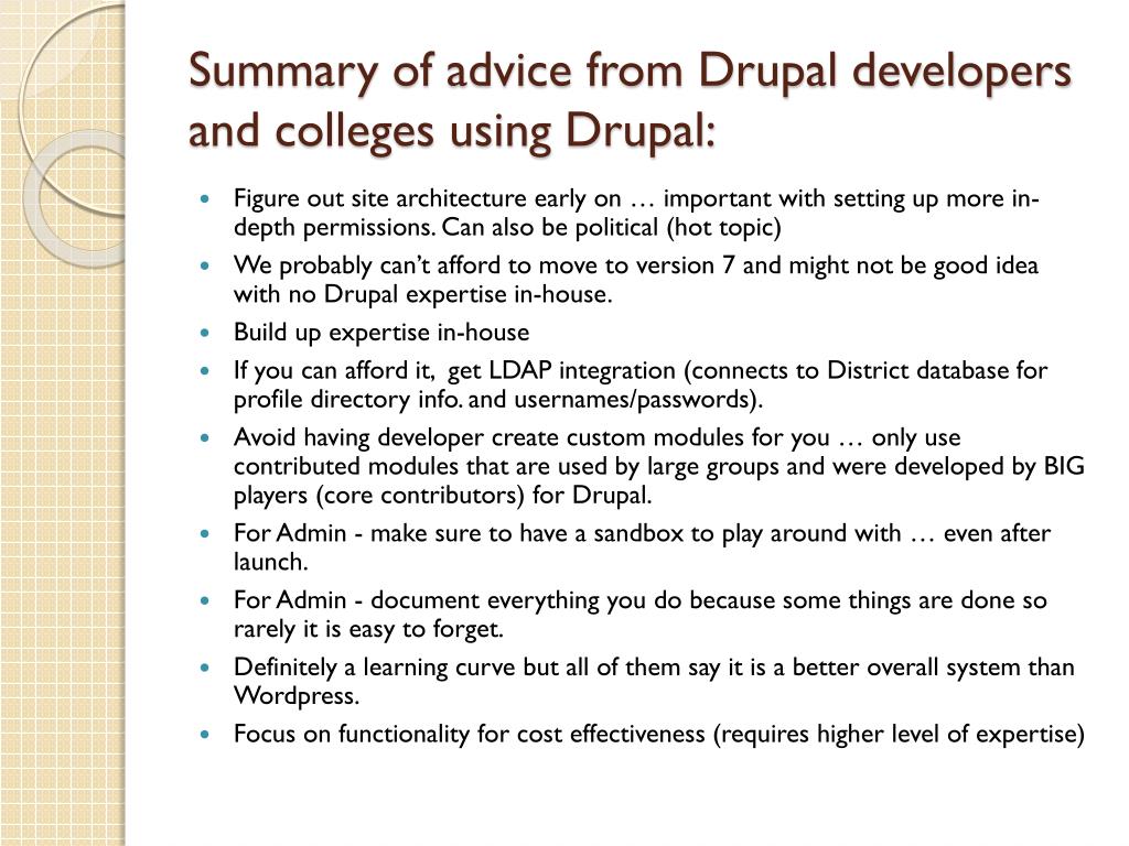 Summary of advice from Drupal developers and colleges using Drupal: • Figure out site architecture early on … important with setting up more in-depth permissions. Can also be political (hot topic) • We probably can’t afford to move to version 7 and might not be good idea with no Drupal expertise in-house. • Build up expertise in-house • If you can afford it, get LDAP integration (connects to District database for profile directory info. and usernames/passwords). • Avoid having developer create custom modules for you … only use contributed modules that are used by large groups and were developed by BIG players (core contributors) for Drupal. • For Admin - make sure to have a sandbox to play around with … even after launch. • For Admin - document everything you do because some things are done so rarely it is easy to forget. • Definitely a learning curve but all of them say it is a better overall system than Wordpress. • Focus on functionality for cost effectiveness (requires higher level of expertise)