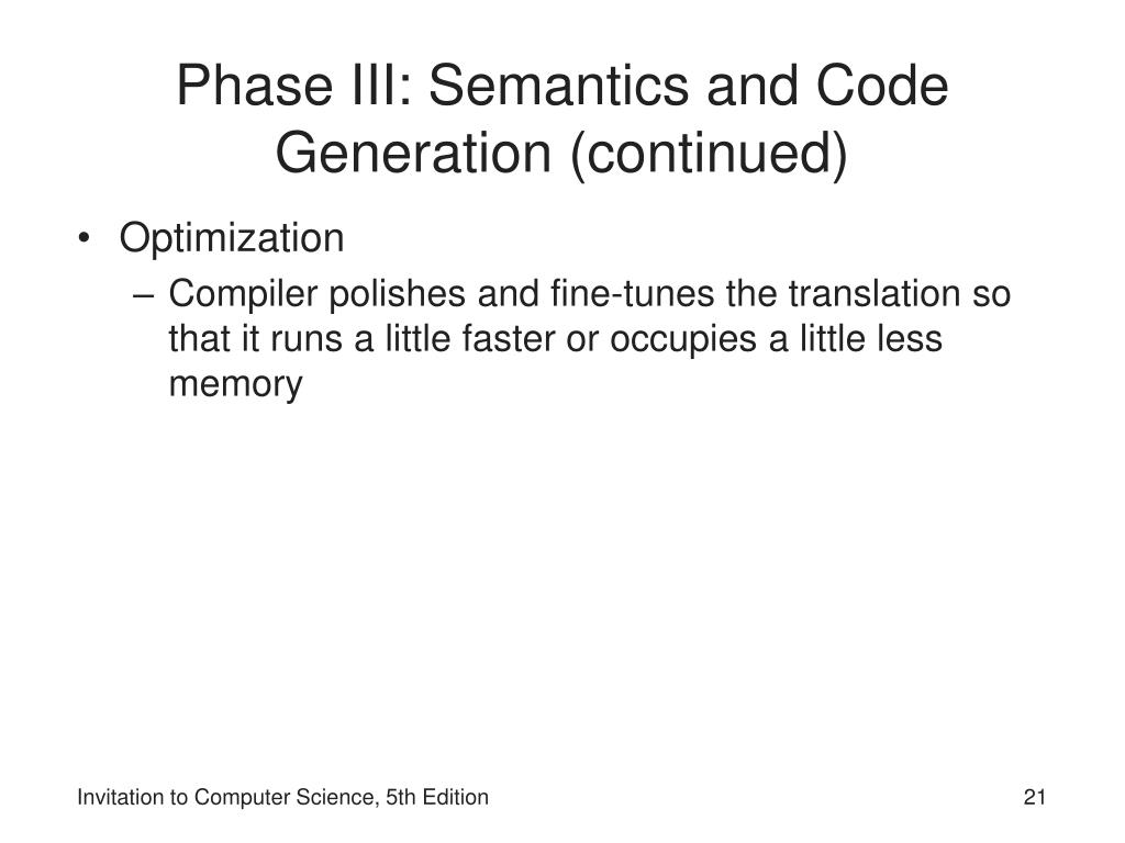 Phase III: Semantics and Code Generation (continued) • Optimization • Compiler polishes and fine-tunes the translation so that it runs a little faster or occupies a little less memory Invitation to Computer Science, 5th Edition