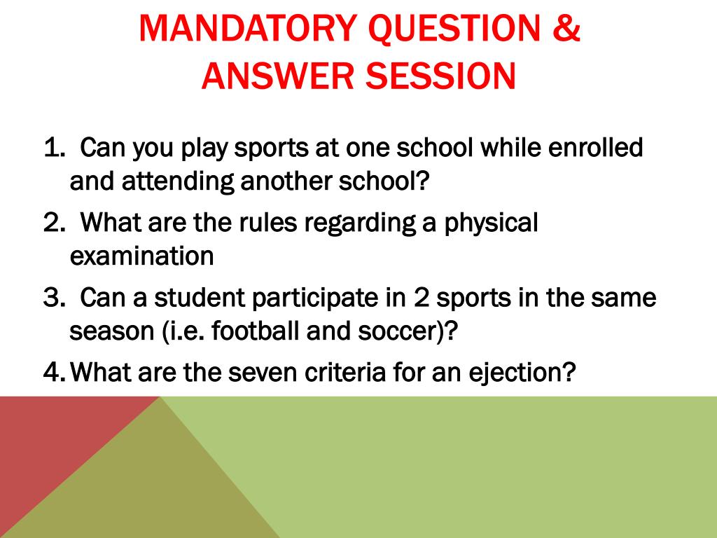 Mandatory Question & Answer Session • 1. Can you play sports at one school while enrolled and attending another school? • 2. What are the rules regarding a physical examination • 3. Can a student participate in 2 sports in the same season (i.e. football and soccer)? • What are the seven criteria for an ejection?