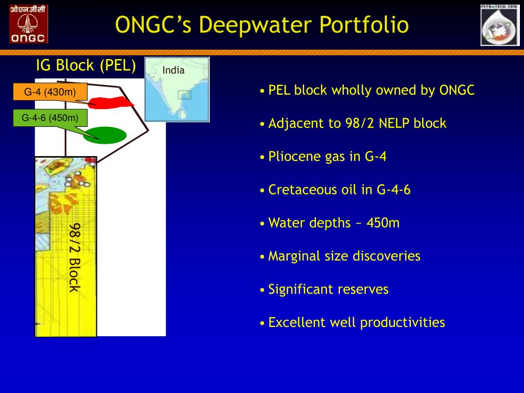 ONGC’s Deepwater Portfolio IG Block (PEL) India • PEL block wholly owned by ONGC • Adjacent to 98/2 NELP block • Pliocene gas in G-4 • Cretaceous oil in G-4-6 • Water depths ~ 450m • Marginal size discoveries • Significant reserves • Excellent well productivities G-4 (430m) G-4-6 (450m) 98/2 Block Oil Gas