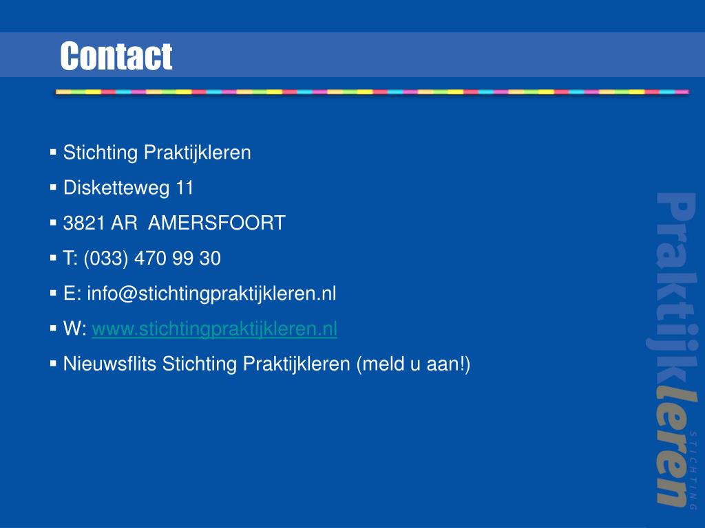 Contact • Stichting Praktijkleren • Disketteweg 11 • 3821 AR AMERSFOORT • T: (033) 470 99 30 • E: info@stichtingpraktijkleren.nl • W: www.stichtingpraktijkleren.nl • Nieuwsflits Stichting Praktijkleren (meld u aan!)