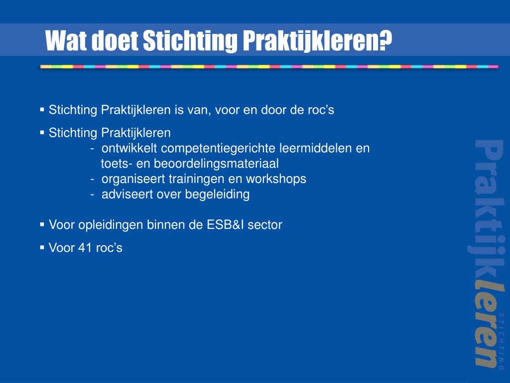 Wat doet Stichting Praktijkleren? • Stichting Praktijkleren is van, voor en door de roc’s • Stichting Praktijkleren • - ontwikkelt competentiegerichte leermiddelen en • toets- en beoordelingsmateriaal • - organiseert trainingen en workshops • - adviseert over begeleiding • Voor opleidingen binnen de ESB&I sector • Voor 41 roc’s